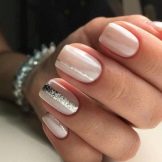 The design of accent nails turns out to be incredibly beautiful when they are distinguished with a special manicure film. This design is called "broken glass." Due to the light color, it looks very beautiful and really resembles a broken glass. You can decorate accents with a special foil ribbon, using special glue for it.