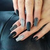 No less expressive is considered a manicure with foil tape. Such a decor allows you to perform a traditional jacket, decorate accent nail plates with transverse or vertical stripes, and create complex geometric patterns. Even one strip on a dark background is enough to make the design look more impressive and expressive.