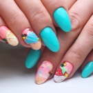 In the summer, a real riot of colors begins. Orange, yellow, electrician and mint, fuchsia, salad - the list is far from complete. In addition, it is in the summer that sliders and drawings are unusually in demand - fruits, berries, marine themes, leaves of all configurations, ice cream and much more. Also in the summer you can meet bright geometry or the water way, sand manicure, a jacket with a neon “smile” - and these are only the options that come to mind first. Nail service masters note that it is the summer designs that customers request to complete that are the most diverse and interesting (in second place is the New Year).