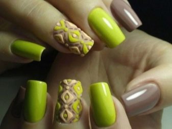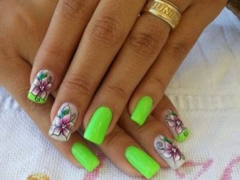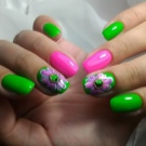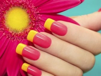 In fact, the phrase “bright manicure” does not imply only a monotonous coating of a saturated color - pink, yellow, mint or purple, although this option is also common. Only one or two nails can be bright, the rest is covered with calmer shades. Hands from this do not look less attractive - on the contrary, such a contrast is even more interesting and fresh.