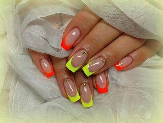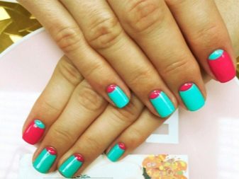 Looks great "moon" manicure from two bright colors (you can also use one bright and the second - neutral). It is also worth noting that in this case it is possible to beat the colors, alternating them: on two nails of the hand to make holes of one color, the main coating - the other, and on the others - vice versa.