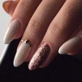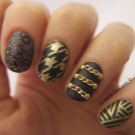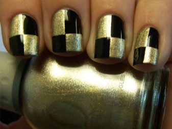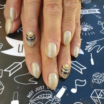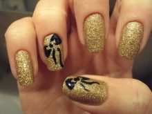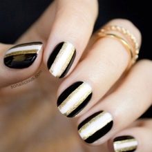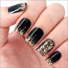 Often, nails are decorated with monograms, sprinkled with an additional shiny texture. There is also an option for publication, when several nails are varnished with black color, all others become gold.