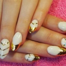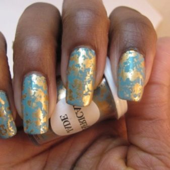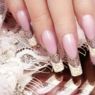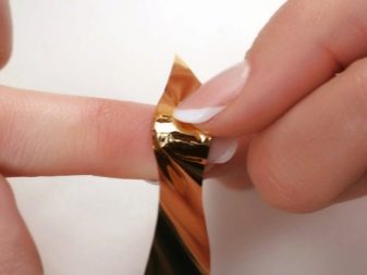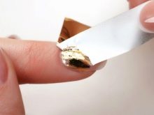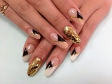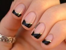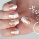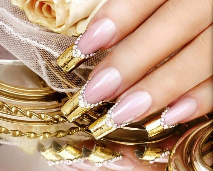 Such a design is not shameful to do even on the day of marriage. Stylists advise using foil to create a jacket. Places of "smiles" are processed with special glue. Special strips are made of foil, which are glued as templates. Then gold paint is applied, after drying the templates come off. To keep the manicure for a long time, it is coated with a topcoat.