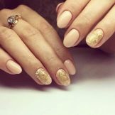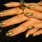 Gold manicure looks good when varnishes with various effects are applied. Now the color is metallic, which shimmers in the sun. Girls usually use a gel polish that lasts on the nail for a very long time (unlike ordinary varnish). Golden gel polish is very expensive and it is not so easy to find it, so professionals recommend using the so-called “rubbing” method. Required for this: