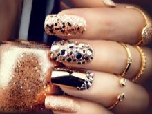 The completeness of the image can be made without the use of "gold", for example, use rhinestones. So, in any case, the masters advise. Rhinestones can look harmonious in any pattern, their combination with gold is another direction for creativity. 80% of the combinations of rhinestones and gold look good. If you say that a combination of rhinestones and gold manicure is suitable for any girl - this will not be an exaggeration.