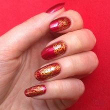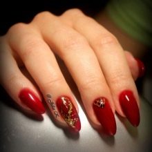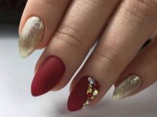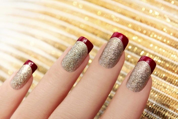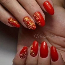A classic is considered a golden manicure with matte red patterns on the ends. This design of nails is popular on all five continents and is considered the highest chic among the fair sex. The good news is that such a design can be done in a comfortable home environment, which significantly reduces cash costs and reduces long hours spent in a beauty salon.