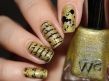 Golden manicure is worn by girls who are internally free, who know their own worth, like to experiment, not being afraid to attract too much attention. Shine of precious yellow metal always looks advantageous and spectacular. Not so long ago, black and yellow manicure was especially held in high esteem. Such a combination claimed an associative series: