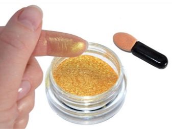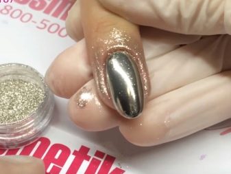 Spangles are applied to the base layer and gently rubbed, then everything is dried under the lamp. Such a procedure can be carried out in several layers, achieving the effect of a mirror or gold leaf.