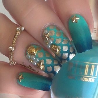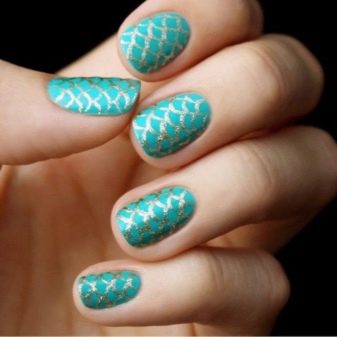 It is very fashionable to wear a manicure on which there is an image of gold scales on the background of the ocean. The “water” theme always looks advantageous and democratic at the same time.
