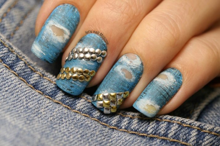 Today, a combination of denim and golden color is popular. On the one hand, a manicure looks impressive, on the other - it is appropriate to wear it daily. All-weather gold manicure is another attractive feature of it. It looks great both for those who walk in sneakers and for ladies who wear high-heeled shoes to go to the theater or restaurant in the evening.