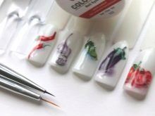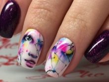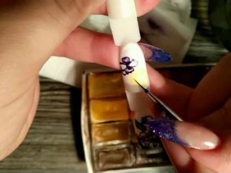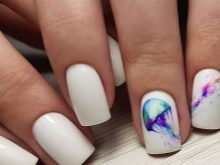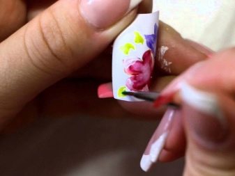 It is important to consider the need for shading the background, for which more water is added to the paint used. This technique will enhance the effect of watercolor on accent nails. Performing the contours in some places of the picture, they try to draw less water on the brush.To do this, use special soft brushes designed for watercolor.