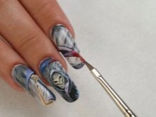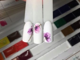 You can draw watercolor paintings in different ways. Sometimes the master performs an ordinary blot on an accented nail, and after drying it paints its contours, for example, in the form of petals, thereby creating a beautiful flower. In addition, you can perform a preliminary sketch of the future drawing, displaying approximate contours. The base is filled with a gradual overlay of color and shades. After that, sometimes dashed lines are sometimes applied to the edges of the print, often underlining the outline with several tones in addition to black.