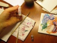 Watercolor paints are bred with ordinary cold water, and therefore problems with consistency in work usually do not arise. In the same way as when working with a paper sheet, a palette is used to dilute paints, obtain the necessary tones, and perform color overlay. In addition, in the work you can use acrylic paints, which also include dilution with water.However, they are distinguished by the nuance that after drying they cannot be removed from the brush, and therefore, in the process of work, it will be necessary to ensure that the brush does not dry out.
