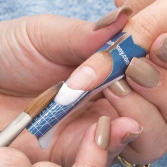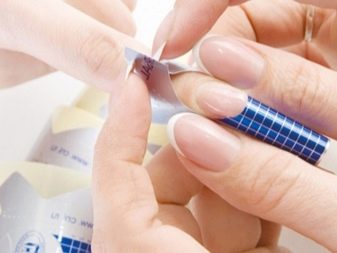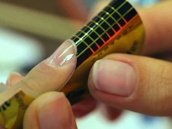 - 6 step. Now it is time to install the template (or form). Try it on the nail and cut to the desired size. The shape should fit snugly to the nail. There should not be even the slightest gap between her and her fingernail. We fix the sticky ends on the finger and once again check the accuracy of the installation.