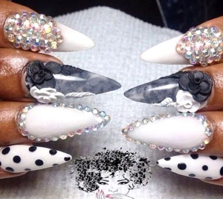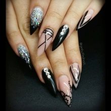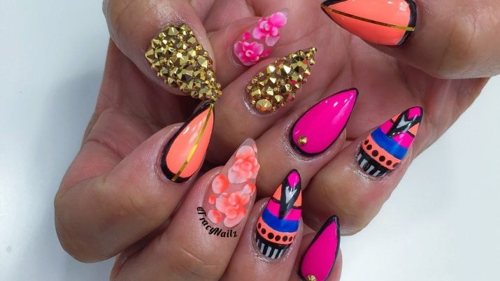 In the design of screaming manicure nails, various techniques for applying the product, the use of the most unimaginable color combinations, non-standard changes in the shape of the nails are applicable. For example, sharp manicure will help to make fingers visually longer and thinner, while stating the owner of the manicure as a shocking and courageous woman.