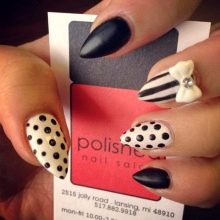 Stilettos are demanding on the choice of equipment, although there are some nuances. For example, their manicure is often combined and too rarely simple. It often looks colorful, and therefore, for the expressiveness of the technique, one has to reduce the number of accents and rely on the uniqueness and nobleness of the texture. Sometimes on stilettos not only two, but even three techniques are combined (classics, moon manicure and French).