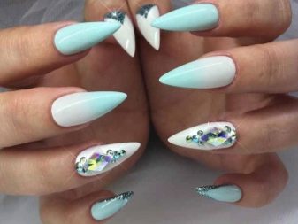 In addition, stilettos can be decorated with rhinestones, inlaid with Swarovski crystals, as well as opals. A very beautiful decor for this form is watercolor painting, in addition to it, you can decorate sharp nails with a slider design, broths, stamping and all kinds of drawings made using stencils. As for aqua design, even insects are used here, as well as dandelion umbrellas, the same Yuki, LED paints.