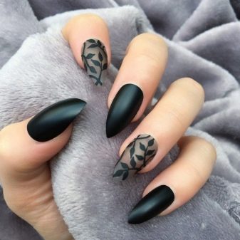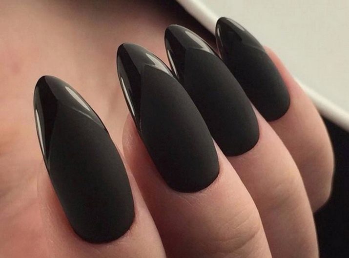 The best types of material for sharp nails are glossy and matte gel polishes. As for the type of surface, the focus of fashion trends is the play of two textures: matte and gloss. Choosing the type of matte finish, you can pay attention to its textile varieties (velvet, satin, velor and suede). Such coatings look status, sometimes drawing out the most concise solution is better than catchy variegation.