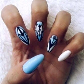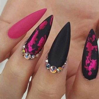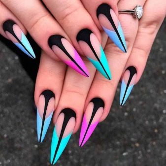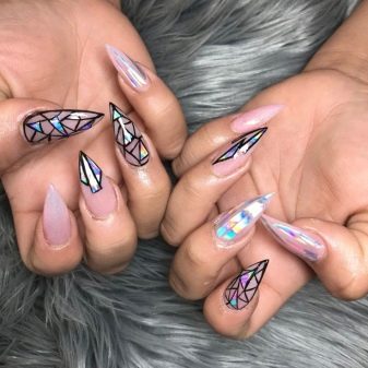 Sometimes the jacket on sharp nails complement the design with holes. This combination looks colorful, because in addition to two techniques, it is decorated with numerous decor. If a professional relies not on an abundance of decor, but on expressiveness, he gets a stylish manicure with two or three accents and a classic design on the remaining nails. Such a design is more attractive from an aesthetic point of view, in addition, it gives the female set a high status than the colorful motley on each stylet.
