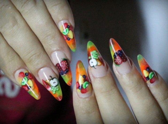 Also, the theme of juicy fruits is popular in summer design, and therefore often short stilettos are decorated with all kinds of fruit compositions. By the way, sometimes they use fimo, which, in addition to introducing a special mood into the design, makes it voluminous. Autumn design can be decorated with colorful leaves, ears, raindrops, umbrellas. In winter, it is worth painting snow on stilettos (in the form of powders, snowflakes, frosty patterns). In spring, fresh colors and drawings of birds are welcome.