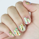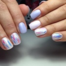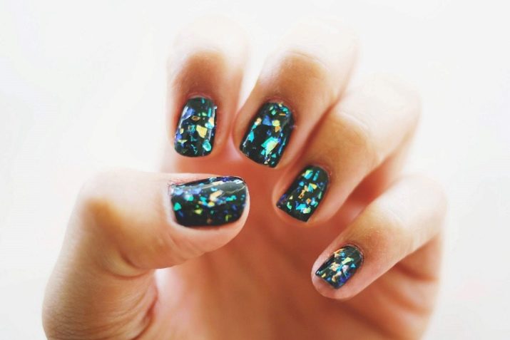 A special film resembling glass gives the manicure a gentle glow. Thinly cut strips are neatly attached to the base with a brush. The first layer for glass manicure can be any color and tone. Over the film, the coating is fixed with a top.