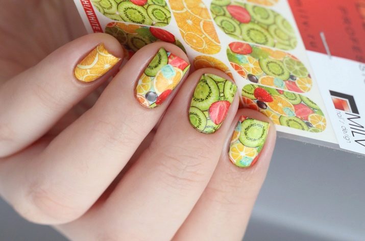 Slider design - unusual drawings, cartoon characters, fruits and berries on one or several fingers, is quite original and attracts everyone's attention. For example, a gentle coating with a bright print in the form of a frog princess will undoubtedly appeal to cheerful and perky girls. It is possible to use several techniques: color jacket, gradient, nail art, rhinestones. Such a manicure looks easy and interesting due to the colorless base and bright additions.
