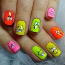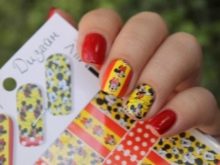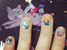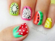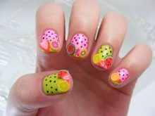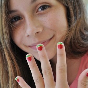 As for the sliders, they are great for children's and teenage manicures, as they significantly reduce the overall duration of the entire work. One picture is glued literally in a minute on the prepared substrate with the base applied on it. When performing manicure with ordinary varnish, the situation is even simpler: the sticker is glued to the dried varnish and closed on top with a layer of transparent coating. Everything that can be broken off, picked up, is not glued to children's nails. Adolescents in this regard are more attentive to nails, and therefore they can be decorated with rhinestones, but pointwise. For example, with a rhinestone you can depict a drop of dew on a flower, a bud, cat eye pupils, berries or grains of fruit (for example, in a watermelon summer manicure).