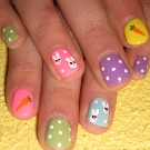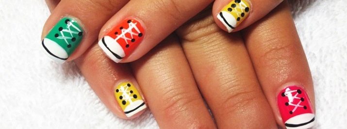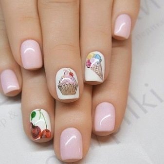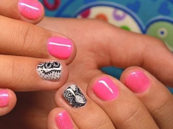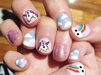 The best decorative elements for children and teenagers will be sliders, stickers on a sticky substrate and multi-colored kamifubuki (Japanese confetti) in the form of circles, stars, hearts, triangles, honeycombs, hexagons, crescents. In addition, you can decorate children's nails with simple drawings. At the same time, you need to select the subject of the picture taking into account the size of the accent nail.