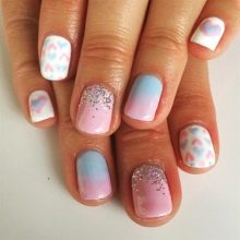 It is fashionable to accentuate the cuticle area, draw fantasy smiles, use the ombre technique, “broken glass”, “veil”, “wet” design when choosing a technique, newspaper manicure, with holes, acrylic sand, drops. It is fashionable to stretch the shades from finger to finger, as well as paint the nails in multi-colored tones of pastel colors.