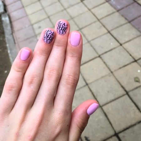- The design of short nails with accentuation of the nails of the ring fingers with a slider design.