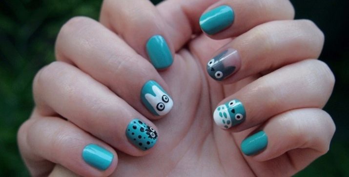 - Design for short nails with totoro, made in a turquoise shade with hand drawing.