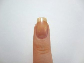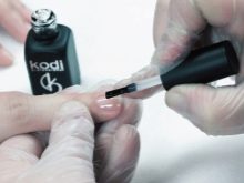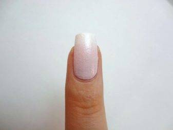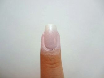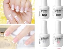 Two coatings are required. One is a skin tone for the main tone, the second is white or any other color as desired, to highlight the tip of the nail. First of all, the base coat is applied to the nail plate, it is well dried. The primary color is also applied and dried.