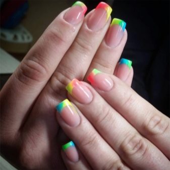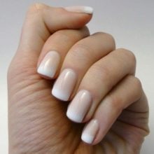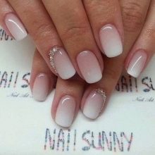 You can decorate a manicure in this technique as the most ordinary varnish coatings., and gel-varnish, additionally decorating it with sequins, rhinestones, stamping. As for the combination of nail design in the French style with a gradient, the latter can be applied in the form of familiar stripes, or it can complement the already drawn jacket on the nails, adding to it the effect. At the same time, the French degradation will also differ in less strict borders between colors than in the classic French.