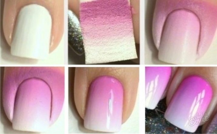 The nail plate is coated with blotting movements., slightly touching the sponge in those places where the color should be barely noticeable, and pressing it more tightly where a more saturated shade is required. The biggest problem when applying this nail art is the removal of varnish from the cuticle. So that it does not get so dirty, you can stick tape around the nail plate before starting the procedure, and after everything dries, carefully remove it. If no protective agents are used, then remove the varnish that has got on the skin, it is necessary immediately after staining the nails.