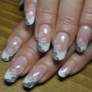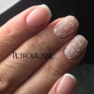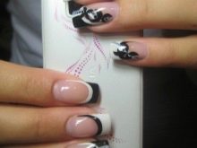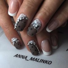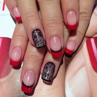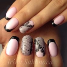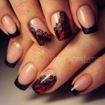 - Lace. Lace patterns have always been popular, but recently they are used more and more often. The most in demand is a French with black patterns. Against the background of pastel shades, he looks elegant, subtle, delicate and very feminine. Lace make out either the edge of the nail, or its hole. There is another option for drawing from one side.