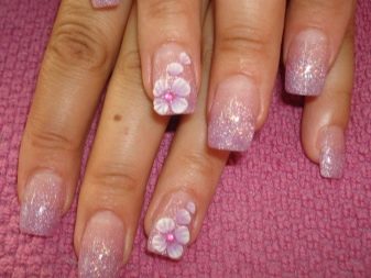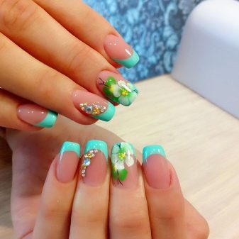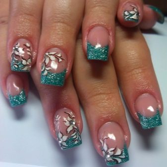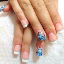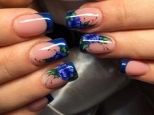 As a rule, French manicure, which presupposes a decoration in the form of a floral pattern, is based on a translucent base, which can be either matte or glossy. Flowers are made with varnish of a brighter shade.