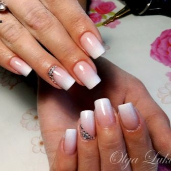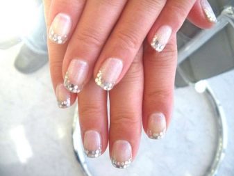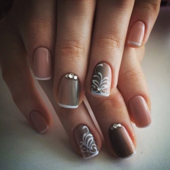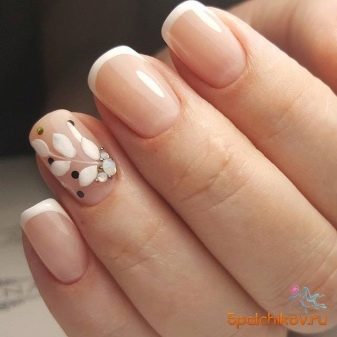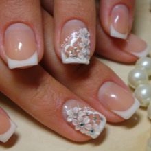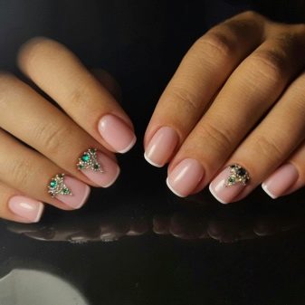 For special occasions and an evening dress, a real find will be a French manicure with rhinestones, glitter patterns or shiny varnish. It should be noted that inlay does not become vulgar, it is necessary to adhere to measures. Rhinestones serve only as a mini-accent, therefore, they either decorate 2-3 nails, but in small quantities, or make a large pattern on the entire plate of one nail. Colored stones are best chosen in the colors of the jacket.