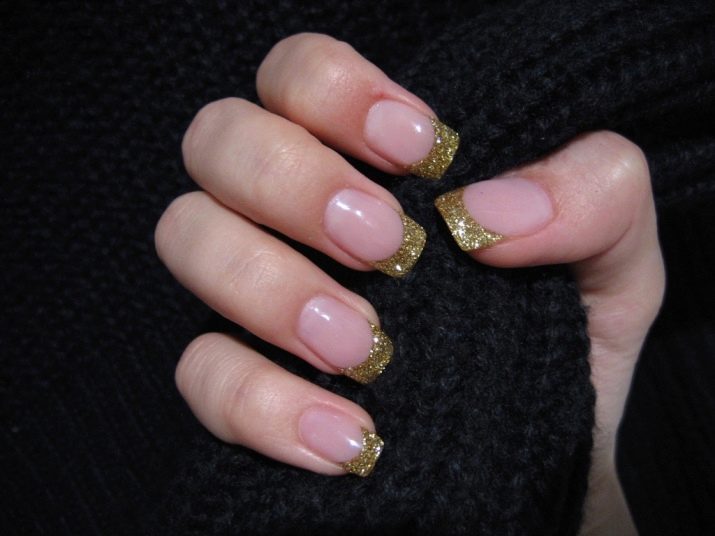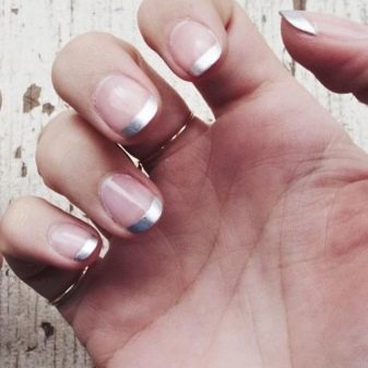 The reverse jacket with a shiny thread, brought out on the bottom of the nail, looks impressive with a shine to match the base. Dark pink or lilac will emphasize the pink nail plate, brown is suitable for beige, black is combined with gold or silver glitter. For the bold, antifrench with a metal contour is suitable.