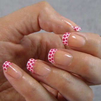 - Dot patterns. To create a point design, stylists use a special manicure device - dots. It is a metal rod with a ball at the end. The size of the points depends on the size of the tip. The pattern can be applied along the tip of the nail or in the zone of the hole. In addition, dots reproduce any shape of a “smile”; it can be not only semicircular, but also square or triangular.