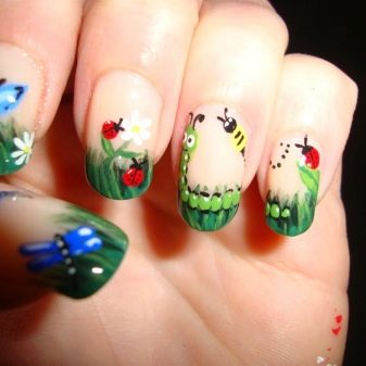 - Flora and fauna. Summer manicure abounds with a lighter design with butterflies, flowers, trees, animals and birds. The figures are performed in different techniques. It is not necessary to draw an exact copy; you can only draw a diagram or drawing in the form of “origami”.