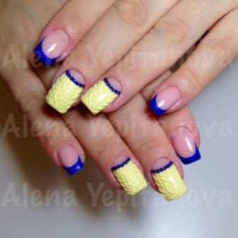 Brave and young girls can use brighter colors for French manicure: yellow, orange, purple, turquoise, red, fuchsia, green, blue and others. He looks original, bold and interesting. However, you should be careful when choosing companion colors that should be from the same palette. For example, yellow goes well with orange, blue with blue and turquoise, purple with lilac, burgundy with eggplant.