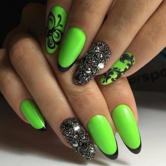 More shiny, saturated with neon, rhinestones or other decorative elements, nails will be more appropriate for an evening look. Various details are used as jewelry: beads, spangles of various shapes, narrow metallized adhesive tape, foil, rhinestones, gold or silver lacquer. Various three-dimensional patterns are laid out from the decor, or they are occasionally added to the picture.