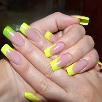 - Acid shades. These colors are very liked by young girls, because they are unusual. It should be noted that they can not cover the entire nail, only make accents in the manicure. When forming a jacket, it is enough to clearly highlight the nail edge or hole.