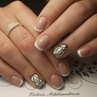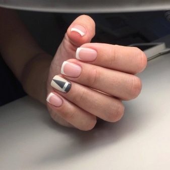 French manicure with geometric patterns on short nails looks very good. Despite the apparent complexity of some shapes, applying them is very simple. To do this, there are a large number of stencils and tools.