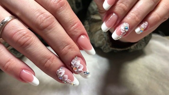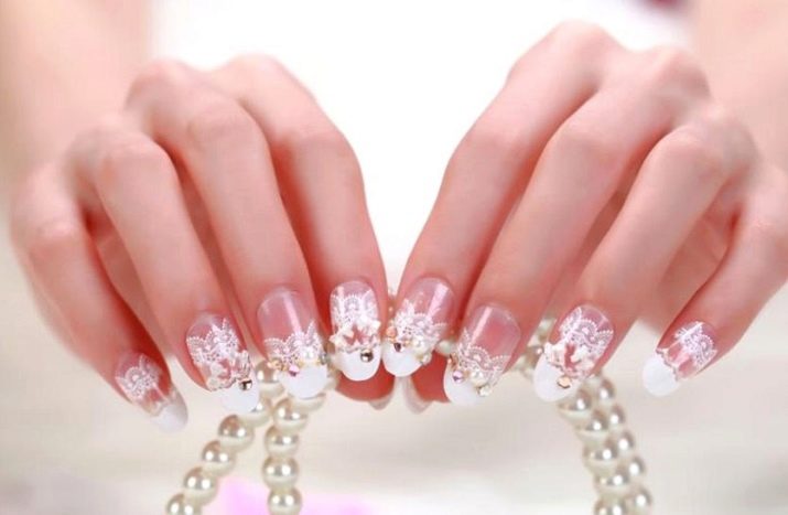 The wedding design of the jacket differs from the others in exquisite decorations in the form of stucco moldings, rhinestones and openwork patterns. As a rule, stylists are guided by the general image of the bride, including the same elements as jewelry for nails, like on a dress or in a hairstyle.