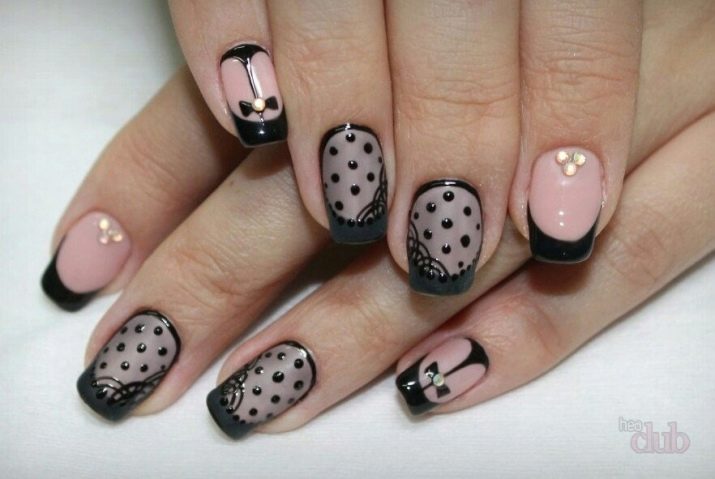 Polymer clay allows you to create a unique holiday manicure, different from all others. With its help create convex pictures. In order not to burden the image, stylists do not advise using decorations on all nails; it is better to decorate only one - on the ring finger. Black lace on a pale pink, flesh or beige background looks elegant and feminine.