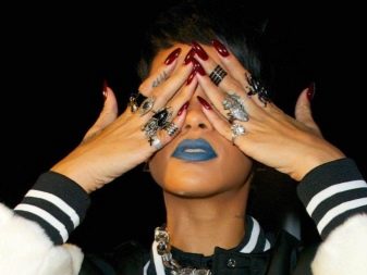 Rihanna also loves to try on various types of manicure. Her nails always differ in sufficient length, and the shape varies from gentle roundness to fatal sharp nails. Among the shades of false nails, you can find an acid palette, as well as multi-faceted dark tones.