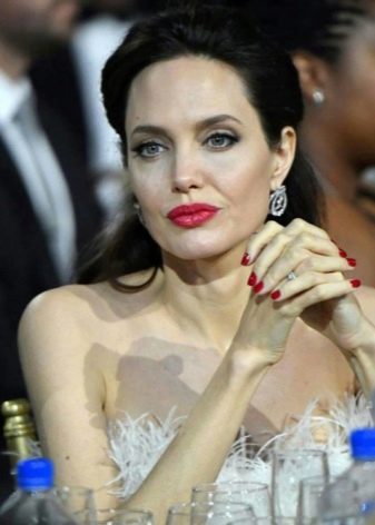Another former lover of Pitt, Angelina Jolie, also takes care of the attractive appearance of the marigolds. Loved to apply scarlet lipstick on chubby lips, Jolie combines it with nail polish in the same color scheme. While in an informal setting, the actress prefers to do without makeup, complementing the natural look with nails with transparent varnish or in nude colors.