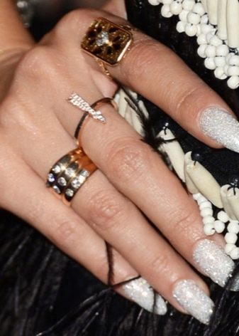 The rival of Selena and the main character of the series “Khan Montana” Miley Cyrus is distinguished by a rebellious disposition not only in her image, but also in the choice of manicure. Long nails, covered with bright varnish, are Miley's hallmark. Sequins, beads, earring rings on nails are just a small part of the accessories used by Cyrus.