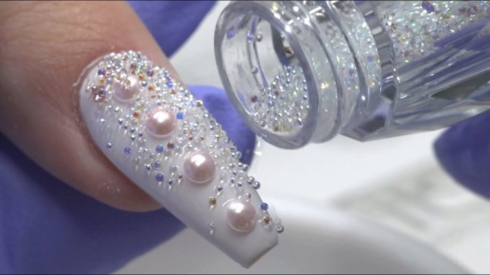 - “Crystal” decor is perfectly combined with other decor for nails - rhinestones, sculpting, beads, pearls.